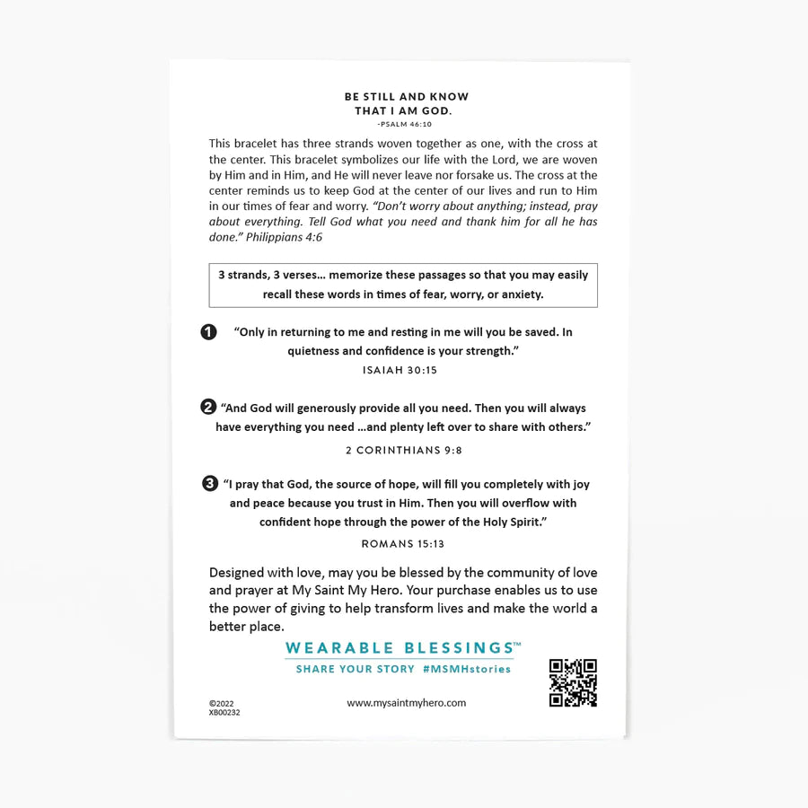Allow the Lord to take your worries and replace them with trust, contentment, stillness, and peace. Let this bracelet be a tangible reminder to sit still, release from all distractions, and gaze into the loving embrace of God. It is within this love that true peace is restored and renewed.