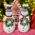 Add a touch of holiday charm to your home with this delightful duo of snowmen. Each snowman is dressed in a glittery top hat, red scarf, and mittens, holding a festive holiday wreath adorned with greenery and bright red berries.