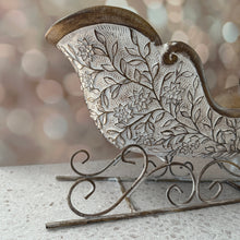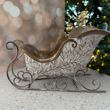 Champagne-This gorgeous sleigh has a mixed silvery-gold coloring. Beautifully crafted with intricate, flowing details, it is perfect for creating a stunning centerpiece or accent piece for any room. Try adding a variety of shimmering ornaments to add a festive feel to your space!