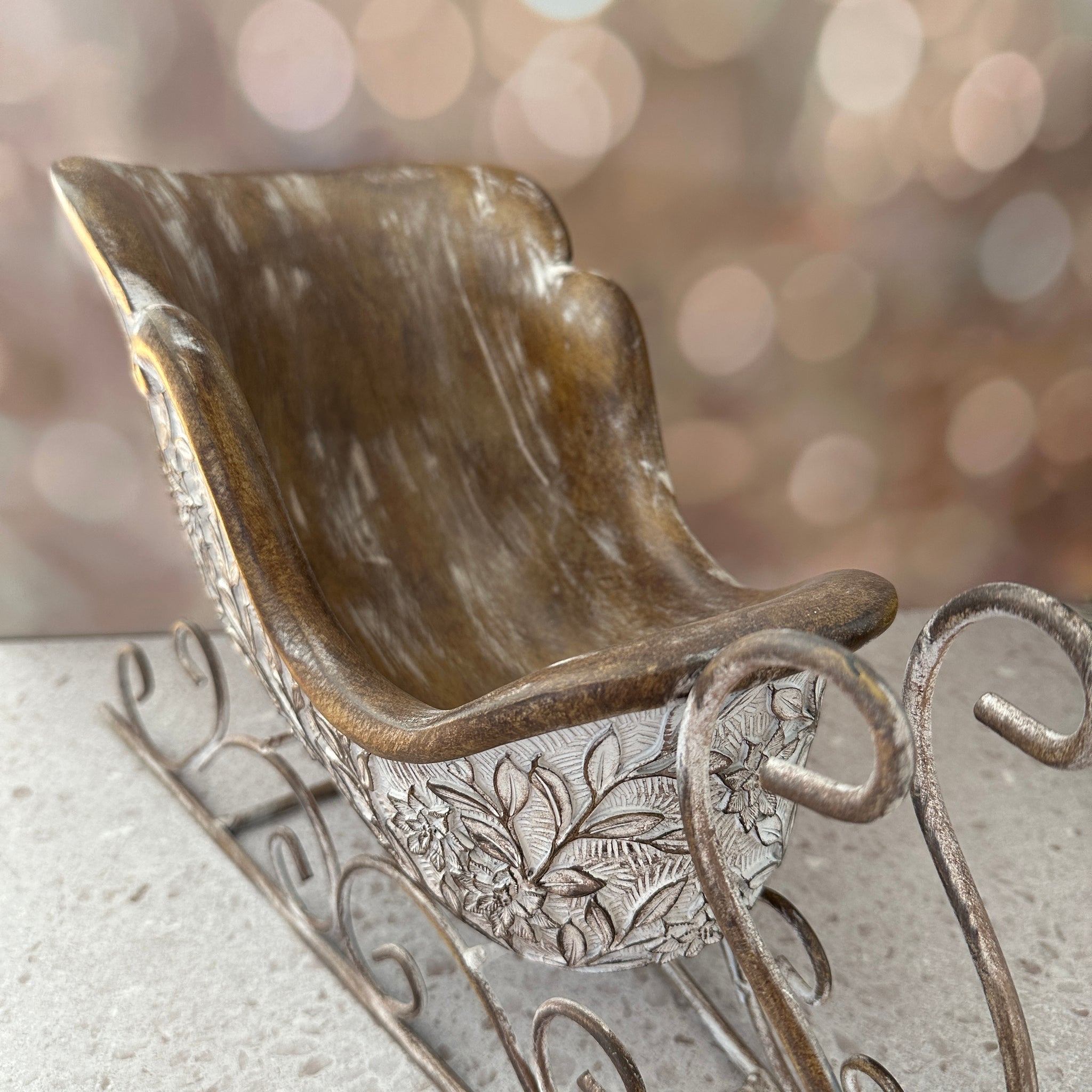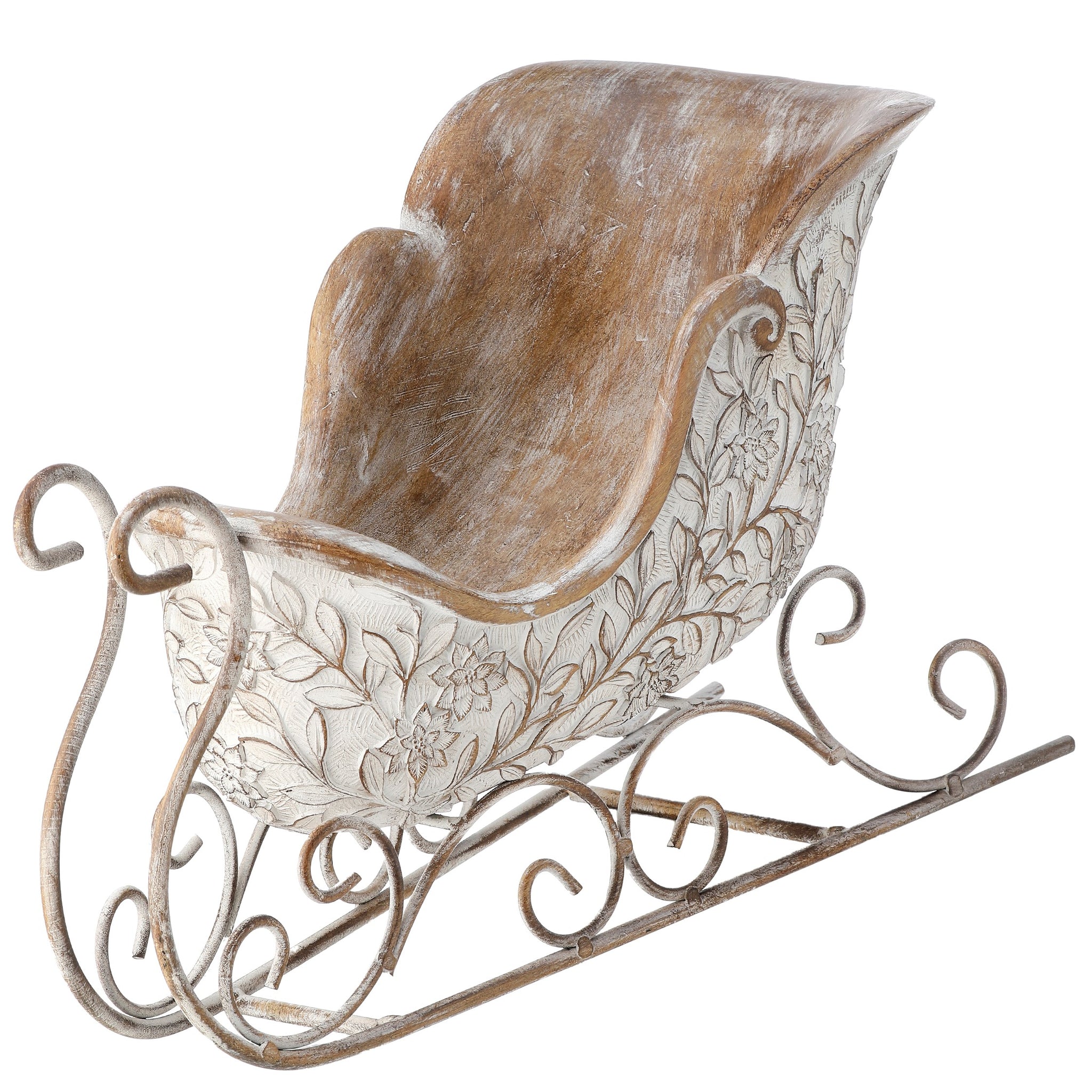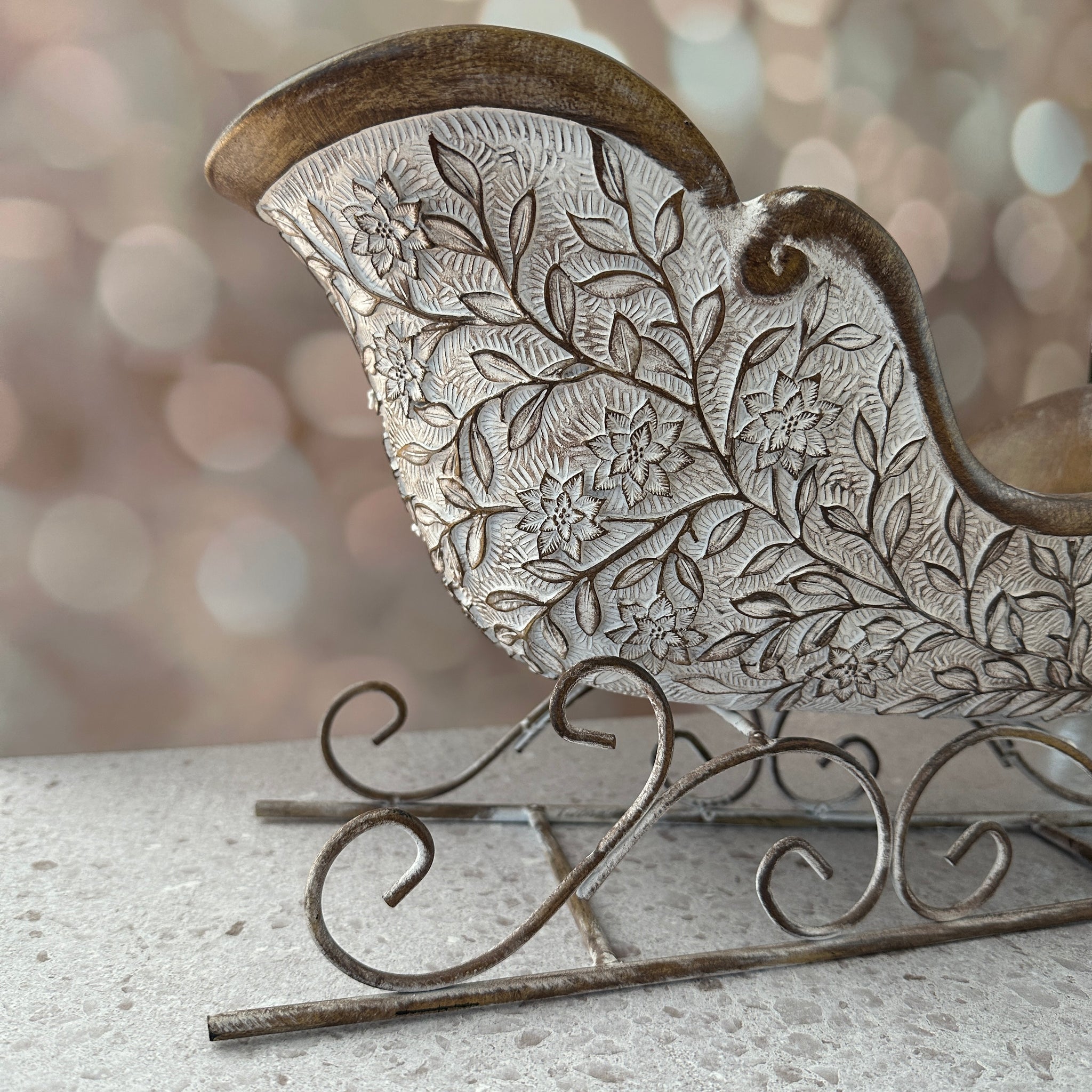 Weathered Wood - This sleigh is the perfect blend of rustic charm and festive elegance. Made to resemble weathered white wood and adorned with intricately carved floral and leaf motifs, it gives off a rustic appeal.