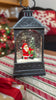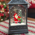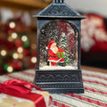 Inside the vintage-style lantern, Santa stands holding a present beneath a snowy evergreen, while a bright red cardinal perches nearby, bringing a cheerful pop of color and a touch of nature-inspired charm.