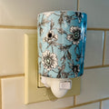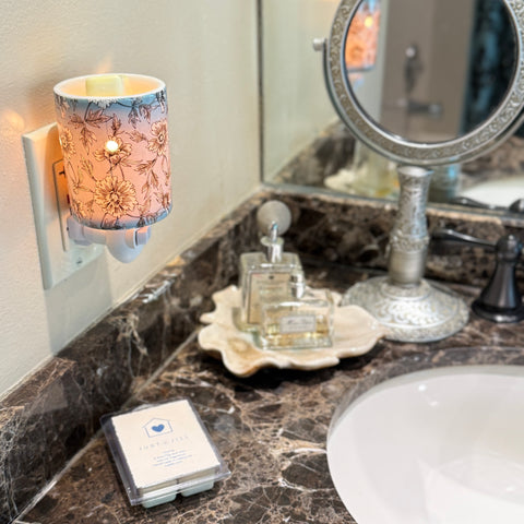 The powdered robin's egg blue and vintage floral print of this ceramic wax warmer add a pretty feminine touch to any space. These pluggable fragrance warmers are ideal in kitchens, bathrooms and other living spaces. If you have pets or small children, do not plug in to lower to the ground outlets.