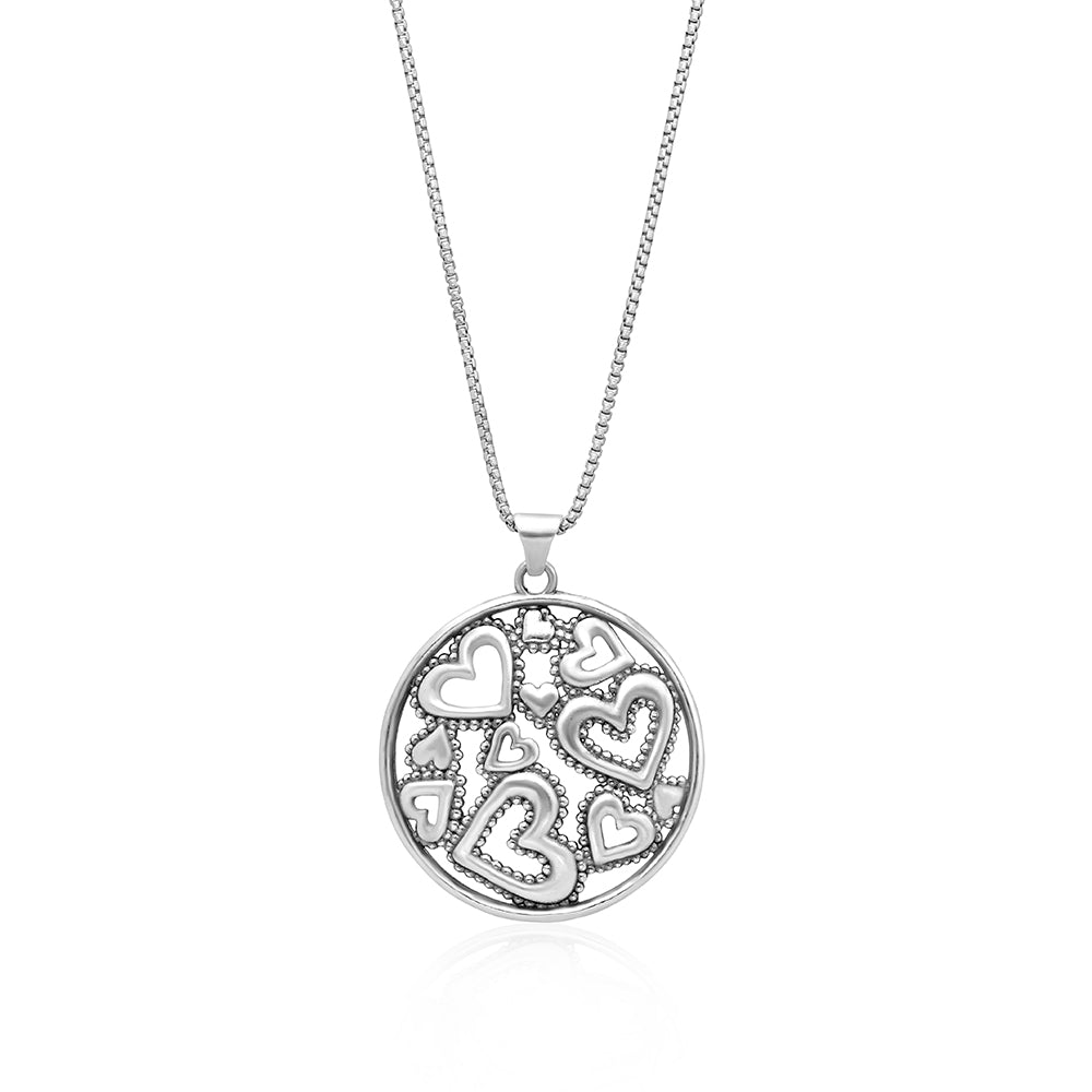 This hammered texture round design pendant with multi-heart openwork beaded border; slight oxidize finish.
