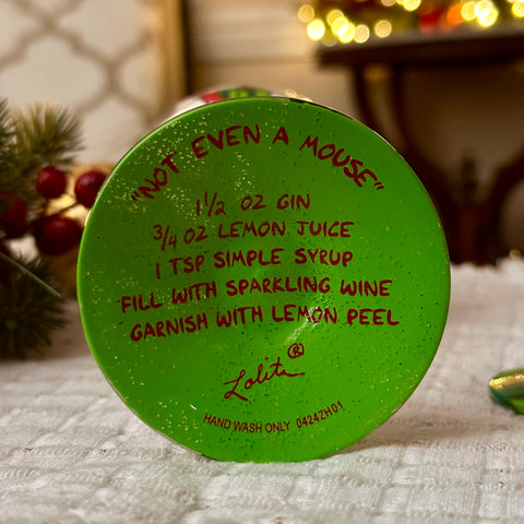 This festive hand-painted wine glass by Lolita shares a scene of Christmas mice stirring about! Dressed in winter clothes and caring presents, the mice enjoy sparkling ornaments and lavish crystals. This playful cup wishes you a merry christ-mouse!