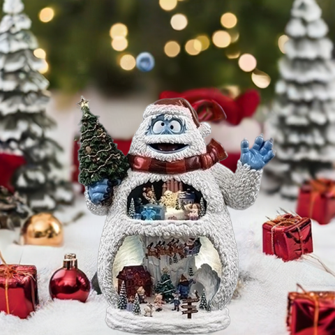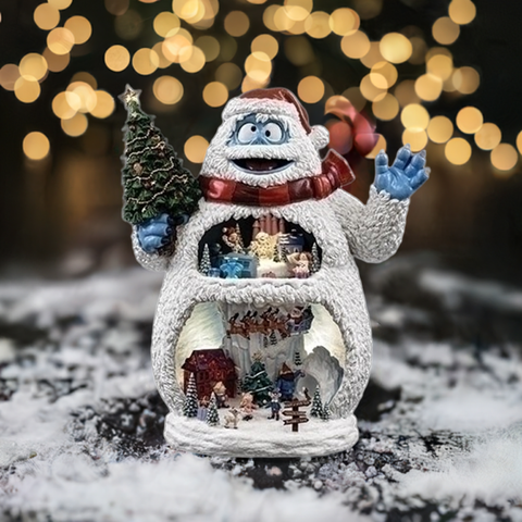 This festive Bumble, inspired by the classic holiday special, stands proudly holding a Christmas tree and wears a jolly Santa hat and scarf. But the real magic lies in his belly—a captivating winter scene filled with tiny, detailed characters and a snowy landscape that lights up with a warm glow.