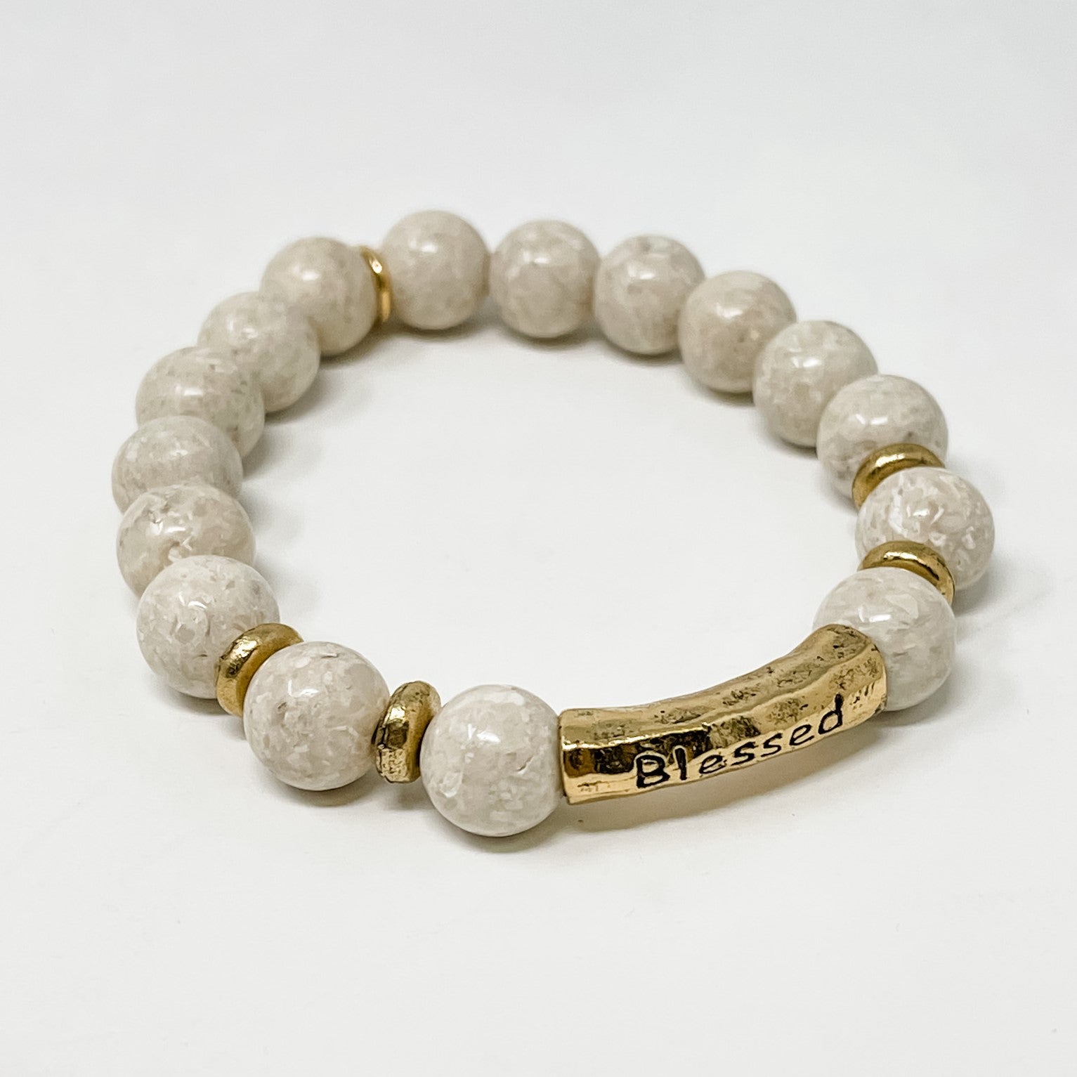 PowerBeads by jen Petites offer a smaller bead for all of the fans of this brand. This beautiful 10 mm Cream Coral bracelet promotes Joy, Happiness and Courage. It features a Gold-Tone Elongated Bead engraved with word Blessed.