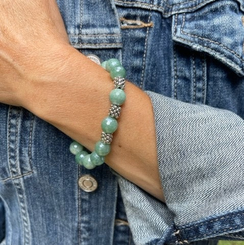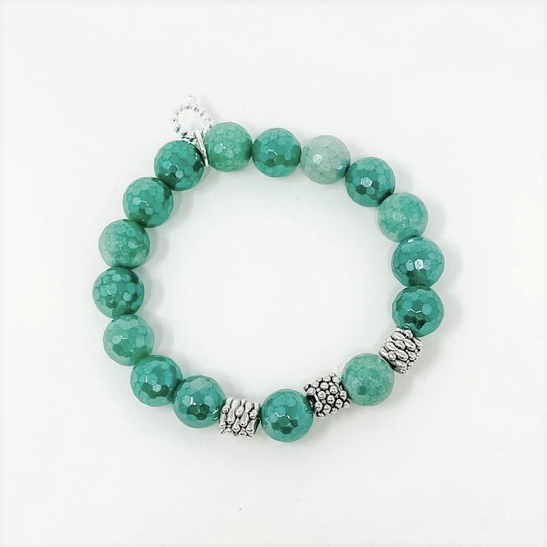 PowerBeads by jen Petites offer a smaller bead for all of the fans of this brand. This beautiful Faceted 10mm Green Aventurine bracelet promotes Creativity, Success and Balance. It features 3 silvertone bead stations that balances the gemstone beads.