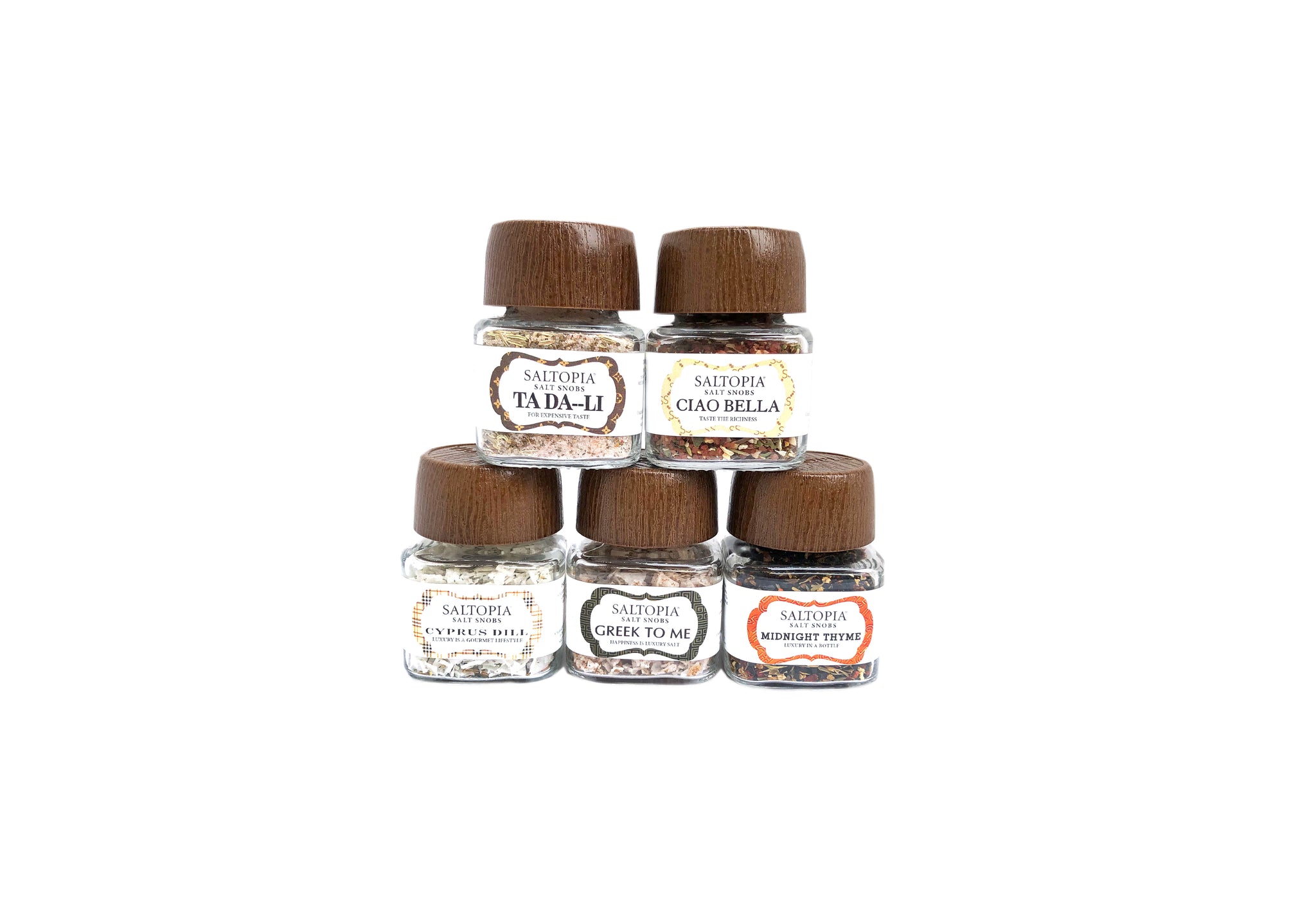 This set includes five SALTOPIA signature spoons, plus these 5 SALTOPIA sea salts in 3.4 oz glass jars perfectly gift boxed: