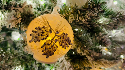 Each one has its own unique design: one features a pinecone motif with two on one side and three on the other, while the second ornament has a different two-pinecone pattern with just one on the other side. These ornaments are perfect for tree displays, mantelpieces, or as thoughtful gifts.